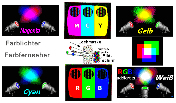 alle drei RGB- Farben auf eine Stelle leuchten, entsteht Weiß. |