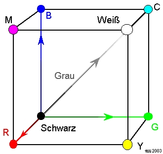 Das ist an dem RGB- Farbwürfel leicht nachvollziehbar: |