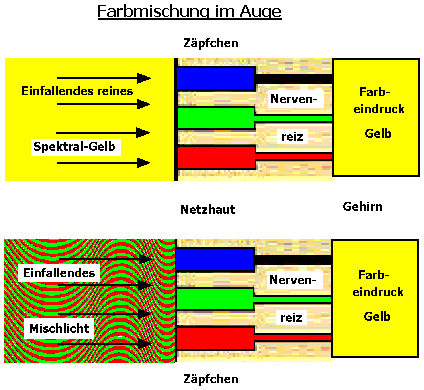 rot- grünes Mischlicht oder die reine Spektralfarbe gelb handelt.