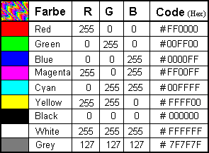 Der additiven Farbmischung am PC liegt das RGB- Farbmodell zugrunde, bei dem jede Farbe aus den Anteilen der drei Grundfarben entsteht. Die einzelnen RGB- Farben können in 256= 16² Schritten zwischen 0 und 255 anteilmäßig zusammengesetzt werden. Sie werden im Hexadezimalsystem als zweistellige Zahl von 00 bis FF angegeben. Im Hexadezimalsystem werden 16 Ziffern benötigt. Zu den Ziffern 0 bis 9 werden die 6 Buchstaben A (=10) bis F (=15) hinzugefügt. So entspricht die Dezimalzahl 45.054 10 der Hexadezimalzahl AFFE 16 und BAD 16 = 2989 10.