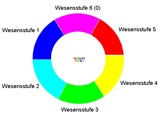 Die Wesensstufe 5 (Rot; Farbe des Blutes) ist jetzt der Mensch.