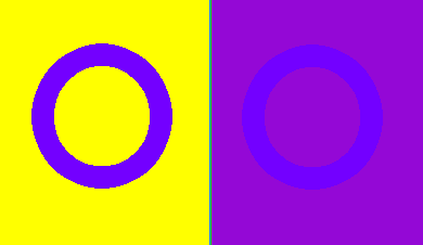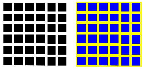 | b) Der Hell- Dunkel- Kontrast ist der wichtigste Grundkontrast und lässt uns die gesamte optische Welt, alle Grautöne, Farben und Formen differenziert wahrnehmen. Den größten Helligkeitsunterschied bilden dabei polar Weiß und Schwarz, farblich Gelb und Violett. Das kann beim betrachten leicht zu Irradionen und zu Irritationen (optische Täuschungen) führen. | ||||||