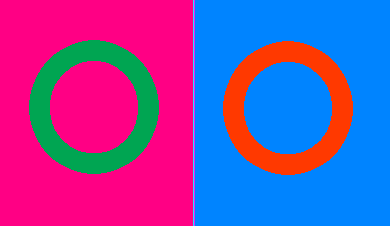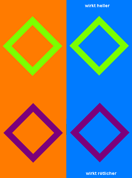 | e) Unter dem Simultan- Kontrast versteht man, dass unser Farbwahrnehmungs- System zu einer erblickten Farbe gleichzeitig (simultan) die Komplementärfarbe verlangt oder selbständig bildet, wenn sie real nicht vorhanden ist. So verändern sich gleiche Farbtöne, wenn sie von verschiedenen Farben umgeben sind. | ||||||