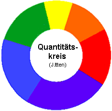 Diese harmonischen Quantitäten ergeben statisch ruhige Wirkungen. Der Quantitäts- Kontrast ist neutralisiert durch die Verwendung der harmonischen Farbmengen. Bei Änderung der Leuchtkraft der reinen Farben, ändert sich zwangsläufig das Flächenverhältnis, um eine Farbharmonie zu erzielen.