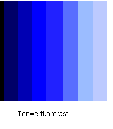 erzeugen, sondern auch Farben, die dem gleichen Farbton angehören, können kontrastieren, wie z. B. Hellblau, Mittelblau und Dunkelblau. Kontraste, die sich auf Nuancen innerhalb einer Skala beziehen, nennt man Tonwertkontraste.