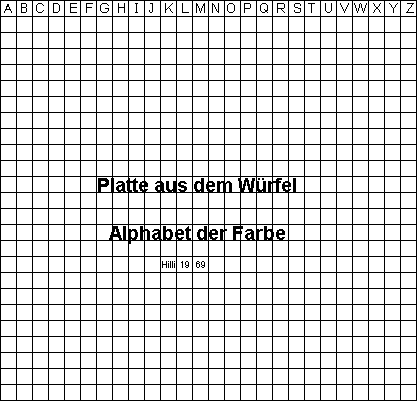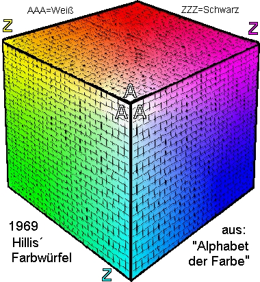 Aus meinem ersten Fehlversuch einer „neuen Farblehre“ dem sogenannten „Alphabet der Farbe“ (Köln1969) stammt der von mir selbst entwickelte Farbwürfel mit dem man immerhin schon fast 400.000 Farbtöne sehr genau bezeichnen konnte. Ich wollte ursprünglich das RAL (Reichs- Ausschuss für Lieferbedingungen /1925) mit den 4 Zahlen wie z. B. RAL 8003 Kupferbraun, RAL 8004 Rehbraun, RAL 8011 Rotbraun oder RAL 8012 Sepiabraun, RAL 8014 Kastanienbraun, RAL 8016 Schokoladenbraun durch mein System mit nur drei Buchstaben ersetzten, was mir natürlich leider nicht gelungen ist. - Ausgehend vom „1 x 1 der Farbe“ von A. Hickethier, der die Farben auf seinem Würfel mit einer 3-stelligen Kennziffer festlegte, wobei die erste Ziffer den Gelb-, die zweite den Rot- und die dritte den Blauanteil des Farbtons angibt und der Zahlenwert den Sättigungsgrad der Farbe bestimmt, habe ich die sich daraus ergebenden 1.000 Farbtöne auf 390.625 Nuancen erhöht, indem ich die Farbqualität durch Buchstaben, die Grundfarben durch neuere ersetzte. Konnte Hickethier die Farbskala Schwarz (999) bis Weiß (000) in nur 15 Schritte aufteilen, sind es im Alphabetwürfel immerhin 35. Die Grundfarben: Echtgelb (ZAA), Magentarot (AZA), Cyanblau (AAZ) bestimmen dabei fast alle differenzierbaren bunten Farbtöne. Die Ausmischungen nach Weiß (AAA) und Schwarz (ZZZ) oder Grau (MMM) und zu den Mischfarben: Rot (ZZA), Grün(ZAZ)und Blau (AZZ) in je 25 Stufen, lassen sich so sehr präzise angeben. (Olivbraun liegt beispiels- weise bei meinem System zwischen (PUM) und (RZT), Pink ist (AND) und Aubergine (EUR), (ROT) bedeutet ein grünliches Grau.