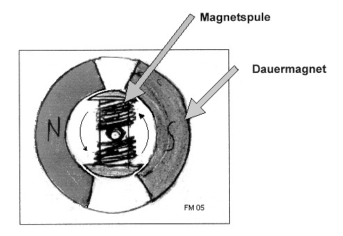 Dauermagnet zieht die beiden Pole der Magnetspulen an, bzw. stößt