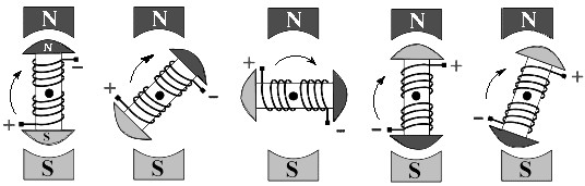 Pole der Magnetspulen. Der Motor dreht sich, da die Spule an einer gelagerten