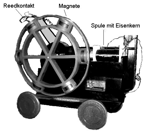 angebracht. Mit Hilfe eines Reed- Schalters wird eine Spule mit Eisenkern