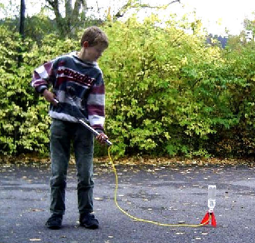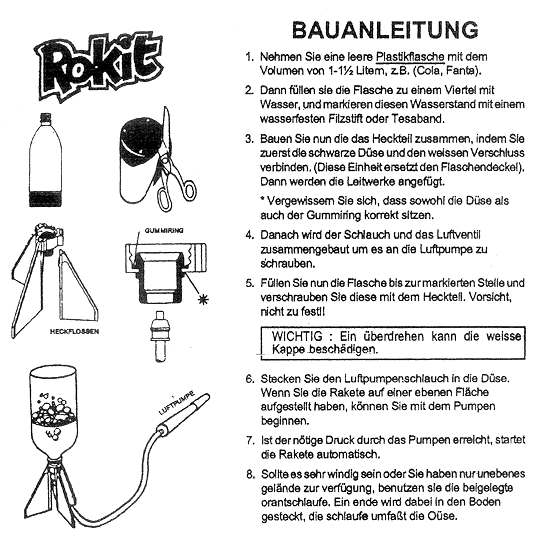 2.1.1 Die erste Wasserrakete, die wir uns aus dem Internet besorgten, hieß "Rokit" und bestand aus einem Kunstoffschraubdeckel in dem ein Spezialgummiring und drei Fassungen für die Flügel außen angebracht waren. Mit einer x-beliebigen Plastikflasche und einem Luftschlauch, der einen Messingkegel an dem einen und ein Fahrradventil am anderen Ende hatte, lies sich die zu einem drittel mit Wasser gefüllt leicht als Rakete abschießen, wenn man sie ca. 30x mit einer Fahrradpumpe auf ca 2,5 bar aufpumpte. Diese Wasserrakete flog jedoch viel zu hoch und danach fand man sie oft nur schlecht wieder, da sie auf dem Dach oder in den Bäumen landete. Der Mechanismus hat uns aber fasziniert, denn bei einem Luftdruck von über 2,5 bar flutschte der Messingkegel aus dem Gummiring und löste so den Wasserraketenstart aus.