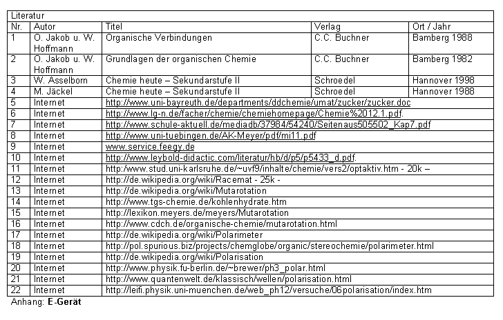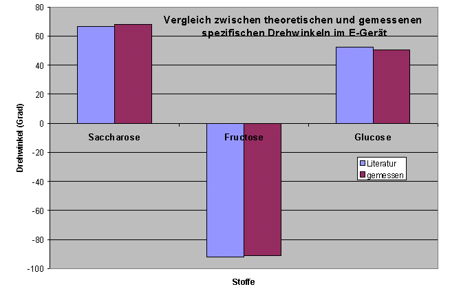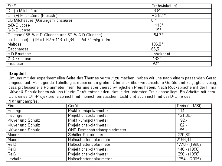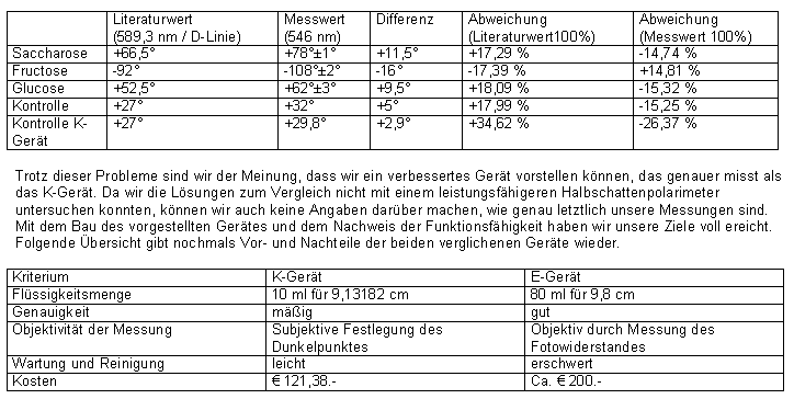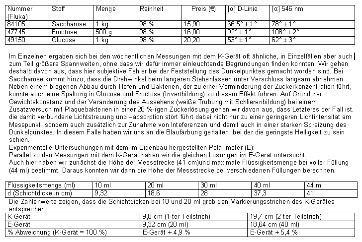 Durch Wiederholung der Versuche wurden die Ergebnisse prinzipiell bestätigt, so dass wir davon ausgehen, dass die Ursachen für die Erhöhung der Drehwinkel mit den Versuchsbedingungen zusammenhängen. Einerseits könnte es an der im K-Gerät benutzten Polarisationsfolie und andererseits im Fehlen des Natriumlichtes (D-Linie) liegen. Möglicherweise spielen auch beide Faktoren eine gleichgerichtete Rolle, so dass dadurch die beschriebenen Abweichungen zustande kommen. Dabei ist es für uns kein Widerspruch, dass die Zunahme der Drehwinkel in unterschiedliche Richtung erfolgt. Vielmehr scheint es so zu sein, dass der Drehwinkel als vorzeichenloser Betrag erhöht, die Drehung im Gerät also unabhängig von der Richtung verstärkt wird. Dafür spricht auch die Tatsache, dass wir im Katalog der Firma Fluka Drehwinkel gefunden haben, die bei 546 nm gemessen worden sind. Dabei ergab sich für Glucose (Nr. 49150) ein Wert von 62° ±3°, während der Wert für die D-Linie bei 53±3 angegeben wird. Man sieht auch daran, dass die Messungen erhebliche Spannweiten haben können, vor allem dann, wenn die Chemikalien wie in diesem Fall nicht ganz rein sind. (98 %-ig). Demnach gehen wir davon aus, dass unsere Entscheidung, kostensparend mit „Billigchemikalien“ zu arbeiten, für die Untersuchung nicht förderlich war und somit zu zusätzlichen Fehlern in den Messungen geführt haben. |