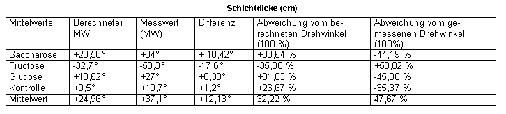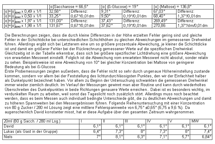 [?] (gemessen) = [?]? x c x d Für Saccharose gilt der spezifische Drehwinkel von 66,5° bei einer Schichtdicke von 1 dm und einer Konzentration von 1 g Saccharose / ml Lösung Bei einer Schichtdicke von 0,49 und 0,5 bzw. 1,97 bzw. 1,98 dm (Differenz: 1 mm) gilt: |