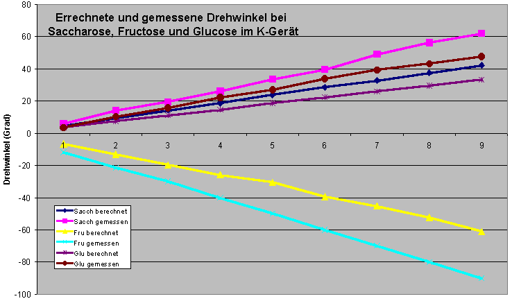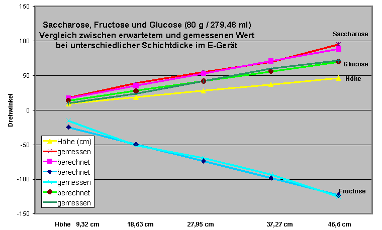 Die erste Reihenuntersuchung mit Saccharose führte erwartungsgemäß zu einer linearen Abhängigkeit. Die besondere Überraschung bestand aber darin, dass die Messwerte von kleinen Abweichungen abgesehen fast vollständig mit den Berechnungen übereinstimmten. Bei den weiteren Messungen mit Fructose und Glucose ergaben sich ähnliche Ergebnisse, wie die folgende Graphik und die Tabelle mit den Mittelwerten zeigt. |
