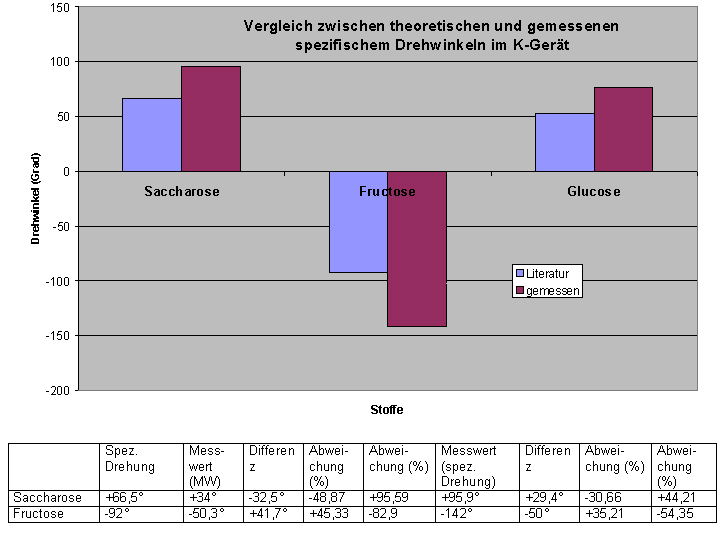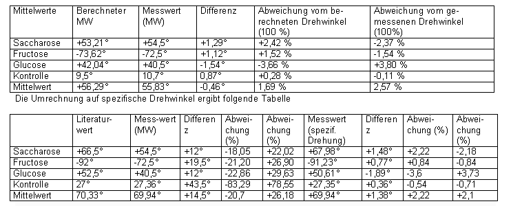 Die eingeführten Mittelwerte betreffen den vorzeichenlosen Betrag und geben somit eine allgemeine Abweichung zwischen den berechneten und erwarteten Ergebnissen an. Insgesamt sind sie also Hilfen in der Auswertung, haben aber keinen eigenen wissenschaftlichen Wert. Im einzelnen ist erkennbar, dass sich bei den einzelnen Zuckerarten doch deutliche Abweichungen von den berechneten Drehwinkeln ergeben. Je nachdem, welcher Bezugspunkt bei der Berechnung der prozentualen Abw2eichung gewählt wird, ergeben sich doch deutliche Unterschiede. Wir haben dann die ermittelten Zahlenwerte nach der Formel <[?] (spezif.) = [?] (gemessen) x 280 / d x 80> auf die spezifische Drehung zurückgerechnet und mit den Literaturwerten verglichen (1 g Zucker / g Lösung bei 1 dm Schichtdicke).Die Graphik zeigt die mittlere Abweichung, die in anschließender Tabelle detailliert dargestellt ist. |