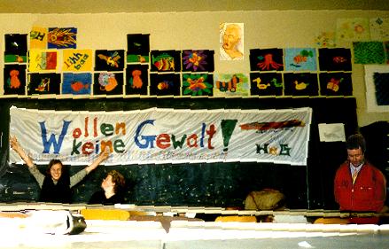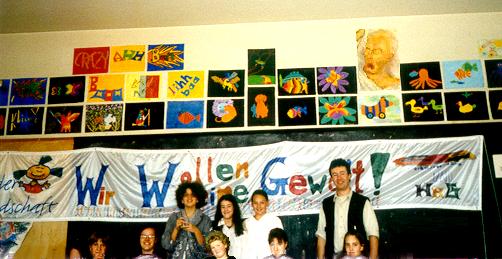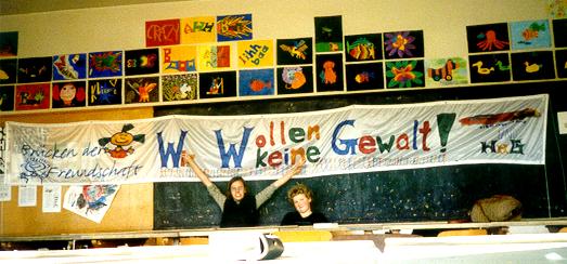 | Vorbereitung einer 'Aktion gegen Gewalt' in Zusammenarbeit mit dem Stadtjugendring | Projekt 'Brücken der Freundschaft' | Die Teilnehmer an dem Projekt 'Brücken der Freundschaft' | Holzbildhauererei und 'Pflanzenputzen' | Ein Blick in den Arbeitsraum der AG | Verschönerung der Jungentoilette | Arbeit am beschädigten Sockels des Schulwegweisers | Start in die Arbeit an einer Holzskulptur | Tanzübungen |
