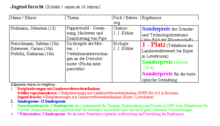 stadt beim Wettbewerb „Schüler experimentieren und Jugend forscht“ im Gründer- und Technologie- zentrum in Solingen. Zwei erste Plätze und jede Menge Sonderpreise sind bei den rund herum ge- lungenen Präsentationen herausgesprungen. Mit Abstand am erfolgreichsten waren die drei Schüle- rinnen der Klasse 10 a, Sabrina Hurschmann, Carina Euteneuer und Katharina Przbilla aus Reichs-hof, die gleich drei Preise für ihre ethologischen Untersuchungen an der Dörrobstmotte <Plodia inter- punctella“ einheimsen konnten. Neben dem 1.-Platz mit der Berechtigung zur Teilnahme am viertägi- gen Landeswettbewerb vom 29-ten bis 31-ten März bei Bayer Leverkusen, erhielten sie den einzigen Ökologiepreis des Landesamtes für Ökologie, Bodenordnung und Forsten (LÖBF) beim Ministerium für Umwelt, Raumordnung und Landwirtschaft (Murl) für besonders umweltrelevante und ökologisch orientierte Untersuchungen und den Sonderpreis für die beste Präsentation im Bereich Jugend forscht. Sebastian Heitmann aus der Jahrgangsstufe 12, der ebenfalls bei den Schülern über 16 Jah- ren angetreten war, wurde für seine chemischen Untersuchungen am Pfeffer mit dem Thema „Pep-perworld - Gewinnung, Nachweis und Diazotierung von Piperin“ mit dem Sonderpreis des Gründer- und Technologiezentrums ausgezeichnet. Im Bereich Schüler experimentieren waren 4 Gruppen angetreten, wobei hier unter 13 teilnehmenden Gruppen nur ein einziger zur Teilnahme Landeswettbewerb (RWE-Net in Bochum am 07. und 08. 05.) berechtigender erster Platz vergeben wurde. Diesen nahm ein glücklicher Sebastian Bruchha- gen (Klasse 8 d) aus Derschlag entgegen, der außerdem noch für seine Arbeit im Fachbereich Biolo- gie mit dem Titel „Die Wipper - eine aufmerksame Exkursion durch einen <Bruchhagen>“ den für die- se Altersgruppe vorgesehenen Ökologiepreis des LÖBF erhielt. In dem von ihm untersuchten „abge- grenzten Feuchtgebietes“, eines sogenannten „Bruchhagens“, stieß er auf eine Reihe geschützter Tier- und Pflanzenarten, für deren Pflege und Erhalt er mit überzeugender wissenschaftlicher Be- gründung vor der kritischen Fachjury eintreten konnte. Die in der Klasse 8 d heimischen Schüler Phil Imhausen (Eckenhagen), Christoph Genster (Gummersbach) und David Hähn (Sinspert) hatten ei- nen voll funktionsfähigen Fahrstuhl in Form eines zwei Meter hohen Modells konstruiert und ein ei- genes Bremssystem FAS-II-PCD / Fahrstuhlabbremssysten-Modell II-Phil,Christop, David) entwickelt und bis zur Perfektion optimiert. Auch sie erhielten zwei Sonderpreise, nämlich den von der HSEP- Agentur für visuelle Kommunikation und Events vergebenen Preis der besten Präsentation im Be- reich „Schüler experimentieren“ und den vom Technologiezentrum gestifteten Sonderpreis für Soft- ware und Systemtechnik für die brillante theoretische und technische Umsetzungen der gestellten Problematik. Die beiden von OStR Rainer Donges betreuten Gruppen aus den Bereichen Physik und Technik waren ebenfalls erfolgreich. Dennis Balcerowiak, Tim Zwetsloot und Tim Pfeiffer, alle aus der 8 c, bekamen für ihre drehbaren Solarthermikanlage den Sonderpreis für innovative Technik und wurden gleichzeitig aufgefordert, mit einer noch weiter verbesserten Version Gerätes beim Wettbe- werb im nächsten Jahr erneut anzutreten. Felix Schulmeister aus Reichshof, Konrad Rohr und Flori- an Funk aus Bergneustadt (Klasse 9a) hatten sich mit der Frage „Wer versteht schon Kilowattstun- den“ beschäftigt und eine Solaranzeige „für einfache Gemüter“ entwickelt. Mit dem Sonderpreis des Gründer- und Technologiezentrums für konstruktive Solartechnik wurde auch ihnen Lob und Aner- kennung ausgesprochen. Insgesamt war das Wüllenweber-Gymnasium, mit 6 Gruppen und 14 Schülerinnen und Schülern, zahlenmäßig wieder mit Abstand das größte und erfolgreichste Team beim Wettbewerb. Insgesamt hatten sich 54 Teilnehmer mit insgesamt 24 Projekten (13 bei <Schüler experimentieren> uns 11 bei <Jugend forscht>) der mehrköpfigen Jury aus Schule, Industrie und Forschung gestellt und ihre Un- tersuchungen in Wort und Bild präsentiert. Abschließend ist noch zu bemerken, dass der jährlich vom Bundesministerium für Bildung und For- schung, Edelgard Bulmahn vergebene und mit € 250.- dotierte Sonderpreis zur Förderung der in die- sem Bereich besonders aktiven (und erfolgreichen) Schulen, aus Gründen der Kosteneinsparung gestrichen wurde. Wie aus verantwortlichen Kreisen zu erfahren war, wird gleichzeitig den sich für diesen Bereich engagierenden Lehrern und Lehrerinnen empfohlen, die nun fehlenden Mittel über den Weg des Sponserings zu beschaffen. „In Anbetracht der aktuellen Diskussionen zur individuellen Förderung interessierter und begabter Schülerinnen kann ich da nur sagen“, so der mit der Betreu- ung und Leitung der AG am Wüllenweber-Gymnasium betraute Lehrer StD Köhler, „da kriegste die Motten!.........“. |