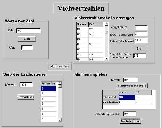 In einer Zeitschrift lasen wir von einem interessanten Mathespiel namens „Minimum“, ein Spiel, das auch mal im Fernsehen gelaufen ist: Zwei Spieler treten gegeneinander an mit der Aufgabe, eine möglichst hohe Zahl so lange zu zerlegen, bis sie bei der 2 angekommen sind. Die Regeln: Man kann die Zahl in zwei Faktoren zerlegen und den kleineren wegschmeißen und mit dem größeren weiter machen. Wenn das nicht geht, kann man aber auch 1 addieren oder subtrahieren und damit weitermachen. Das kostet aber einen Punkt. So gibt es Nullwertzahlen, die beim Zerlegen keinen Punkt kosten, Einwertzahlen, die einen Punkt kosten und so weiter. Wir hatten Lust, die Suche nach dem Wert einer Zahl und auch das Minimumspiel zu programmieren, und zwar in Delphi. Wir merkten sehr schnell, dass wir dazu ganz schön viel Mathe brauchten, zum Beispiel Kenntnisse über Primzahlen. Das Programm läuft inzwischen super und die Programmoberfläche sieht so aus: |
