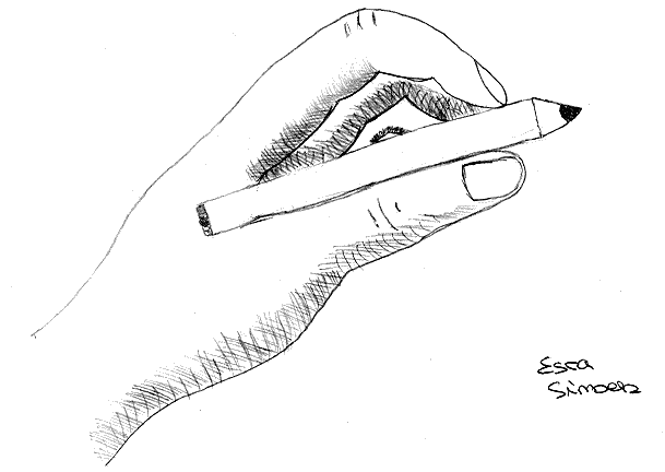 Die linke Hand hält einen Stift