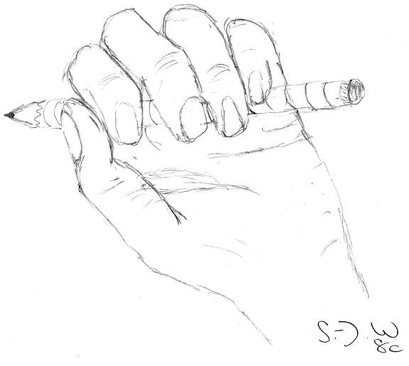 Die linke Hand hält einen Stift